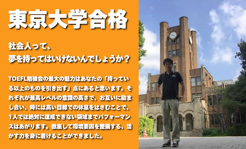 東大入試2週間前、弟さんが倒れ、半身不随になるのではという事態に動揺が走りました。家族が大変な時に、東大を受験している場合ではないので、試験は来年に持ち越すということに話にまでなっていたんです。ですが、そんな中、しっかりと気持ちを建て直し、直し挑戦しました。( 素晴らしい強い精神力でしたね。さすが、お兄ちゃん。)さて、わたし達は、名門勉強会として生徒さんには、やさしいだけの適当なアドバイスだけはしないように心がけています。初めてお会いしたころの中西さんの東大合格率は、文字通り0%、つまり、合格することは【ありえない】状況、「まずは、合格率2~3%まで上げよう!」これが最初の頃のわたし達の合言葉でした。会社での働く時間を最悪半分までに減らすように伝えたのもこの時期です。当時の中西さんのレベルから、週末にも及ぶ会社を続けて東京大学に合格する事はありませんでした。(わたし達、TOEFL勉強会は【強烈なアドバイス】をすることで有名ですが、)突飛なアドバイスをする方もする方ですが、それを実際に行動に起こした彼の方もすごいです。中西さんは、おっしゃました。「古き悪しき習慣を拭い去り、新しい自分を築きたい。」 彼のビジョンは間違っていない。後は、それを成し遂げる強い信念を持ち続けられるかどうかです。自分を変革させたい気持ちと、合格する可能性が1パーセントでもあるなら、私は、鬼にでも悪魔にでもなると、その時 決めました。ニッポンの社会人にとって会社や仲間とのつながり、そしてその中で自分の夢との折り合いをつけるのは、時に大変なものです。( 彼が勉強している間、友達の結婚式は3,4件は、勉強のためにキャンセルしたようですね。笑。)会社の協力もいただき(理解あるステキな社長さんよかったですね。)学習環境は整ってきました。