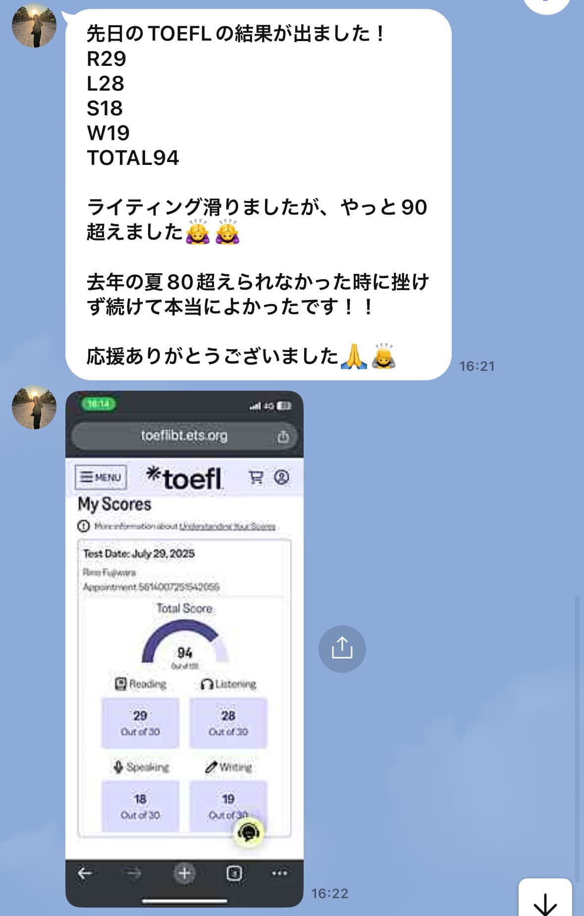 勉強会のみなさん!お疲れ様です!!やっっっと90突破できました!!長かった!!いや、長すぎた!!(笑)一番勉強時間が取れているはずの私がなかなかスコア出せないので、社会人ならなおさら、、と不安にさせてしまっていたような気がします(笑)なので結果が出てとにかく安心しています!!やればきちんと結果はついてくることを少しは証明できたかなと思います!!勉強会にいなければ出会えないような社会人のみなさんから多くのことを教えていただき、沢山救われたなと思います。飽きてやる気が出ない時でも、みなさんの学習記録やスコアをみて焦って勉強しなきゃ、っていう気持ちになれたり、バイクに乗せてもらって気分転換したり、皆さんの海外エピソード、銀行の話、子育ての話など色んな話聞いて元気になったり、、とりあえず一区切り、ありがとうございました!!皆さんの夢、応援してます!!私も頑張ります!!
