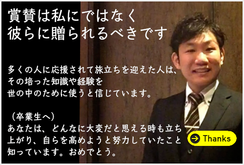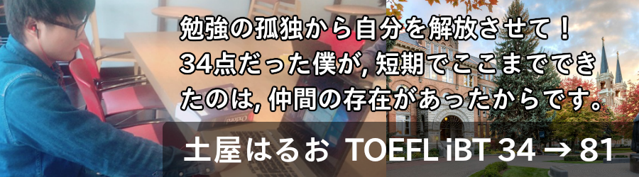 TOEFL®で思うようなスコアが出なかった時もたくさん落ち込みました。でもそんな時に引っ張り上げてくれたのは、まぎれもなく皆なんです。まずありがとうと言いたいです。何回ありがとうと言っても感謝の気持ちを表しきれません。これほど仲間の存在に感謝したことはありませんでした。本当に僕は恵まれた環境にいるんだなと嬉しくなりました。この勉強会を通じてできた仲間は、僕の一生涯の財産です。 こんな僕でも慕ってくれて、尊敬してくれて、なにより仲間として認識してくれた皆を、僕は一生忘れません。 本当にありがとう。